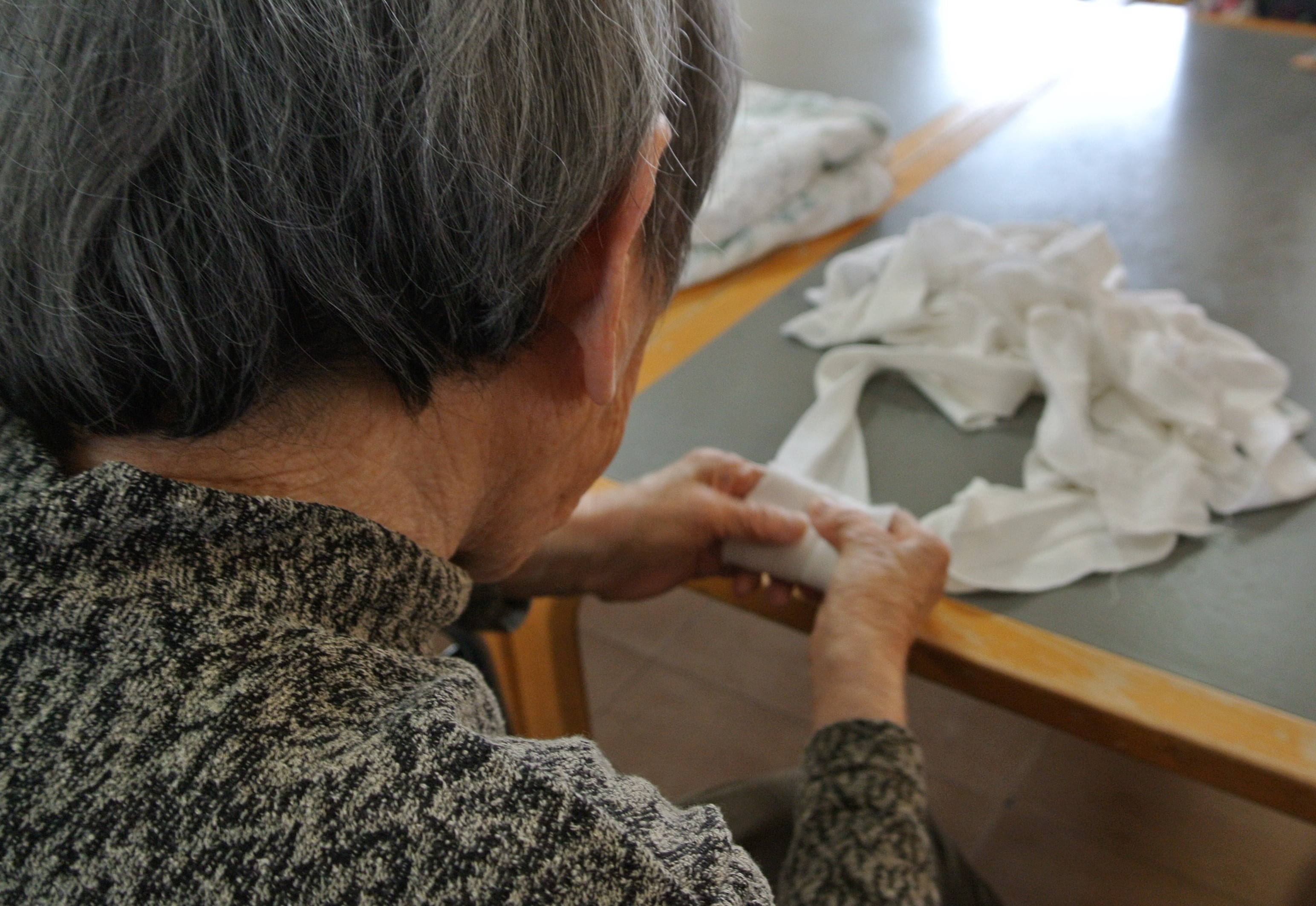 リハビリの一環として、洗濯した包帯を巻いていただいています。