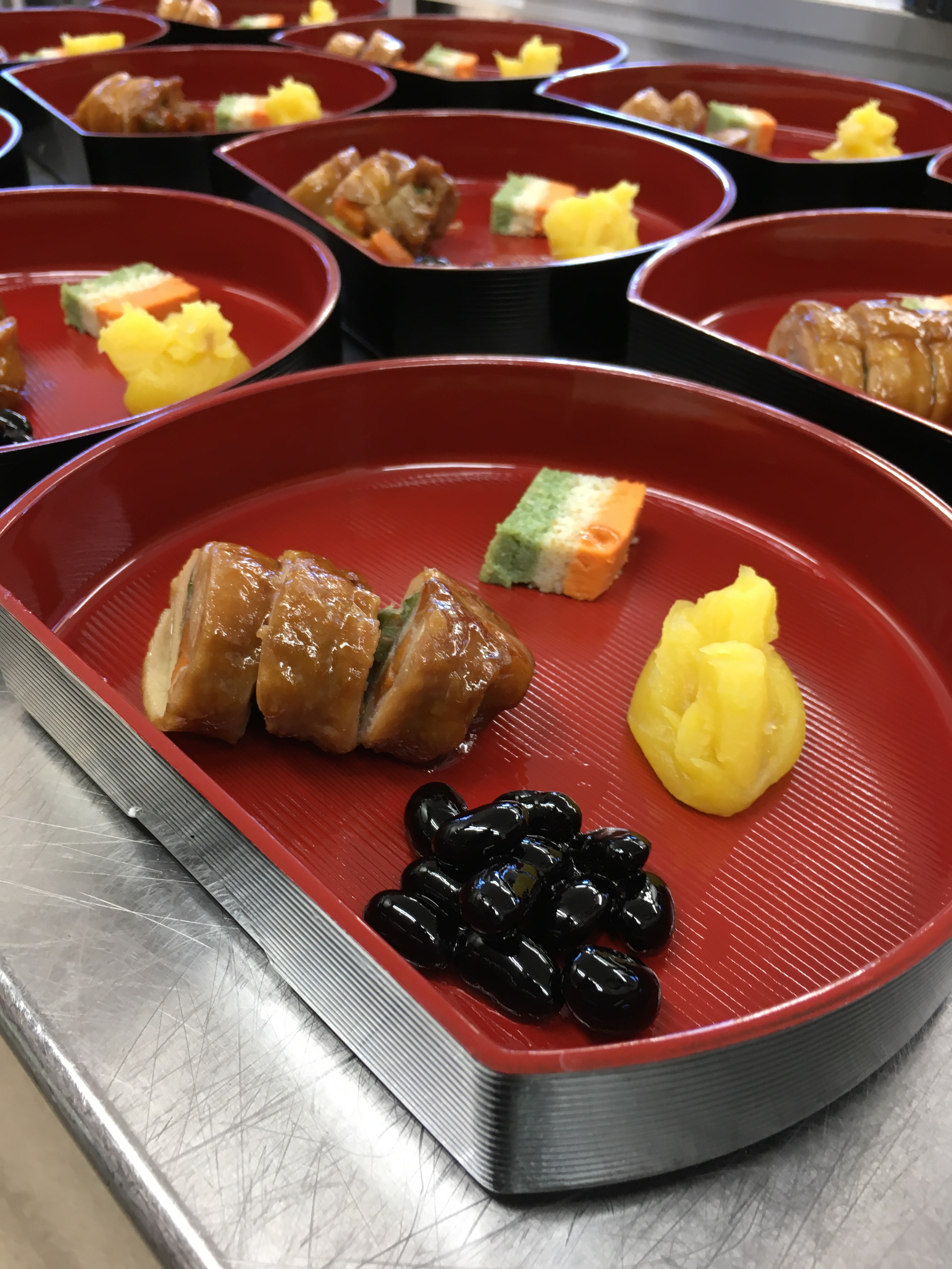 昼:赤飯、金目鯛の西京焼き、煮しめ、豚汁、黒豆