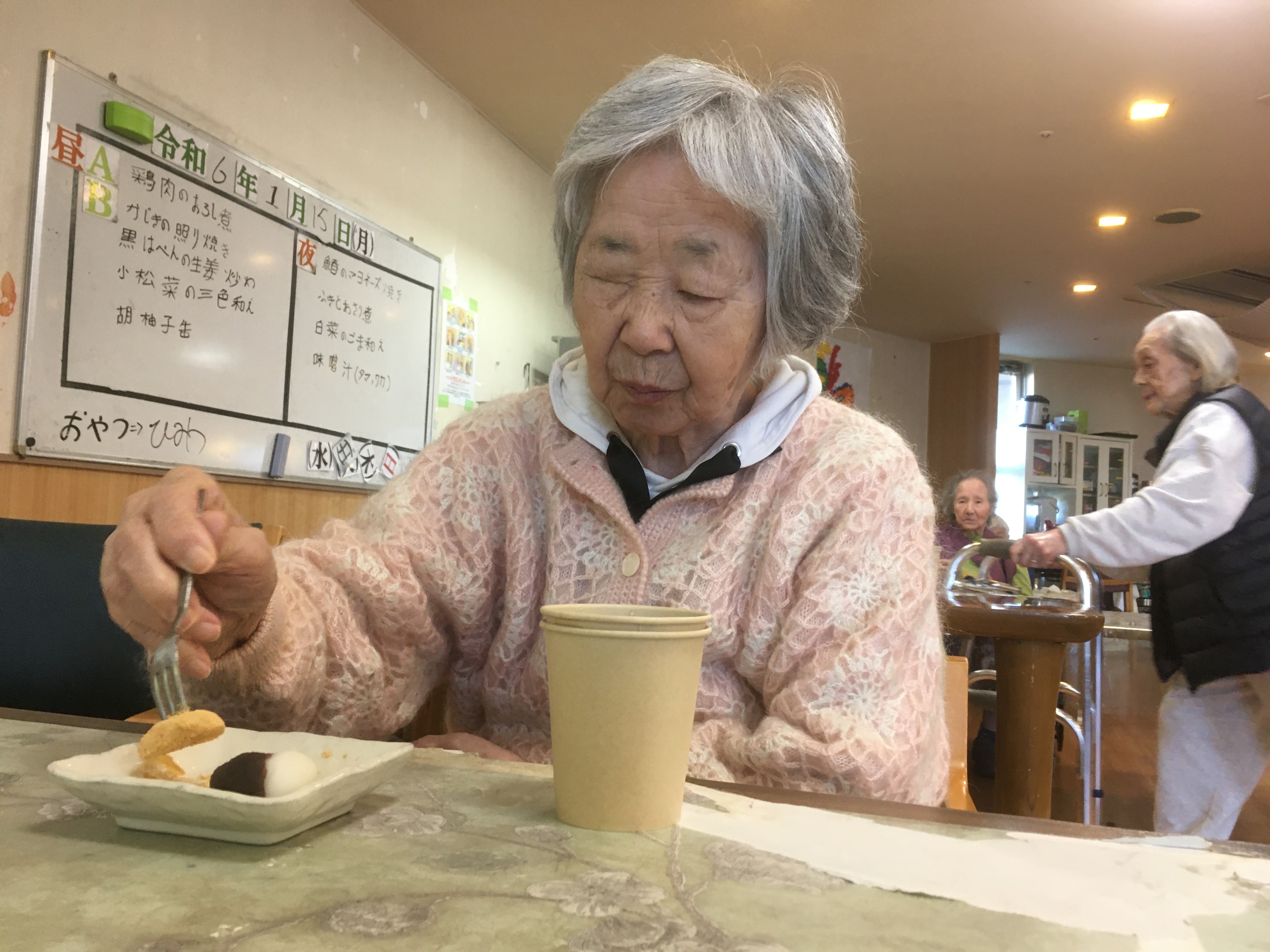 おやつでは、大きなケーキを人数分に切って食べました。