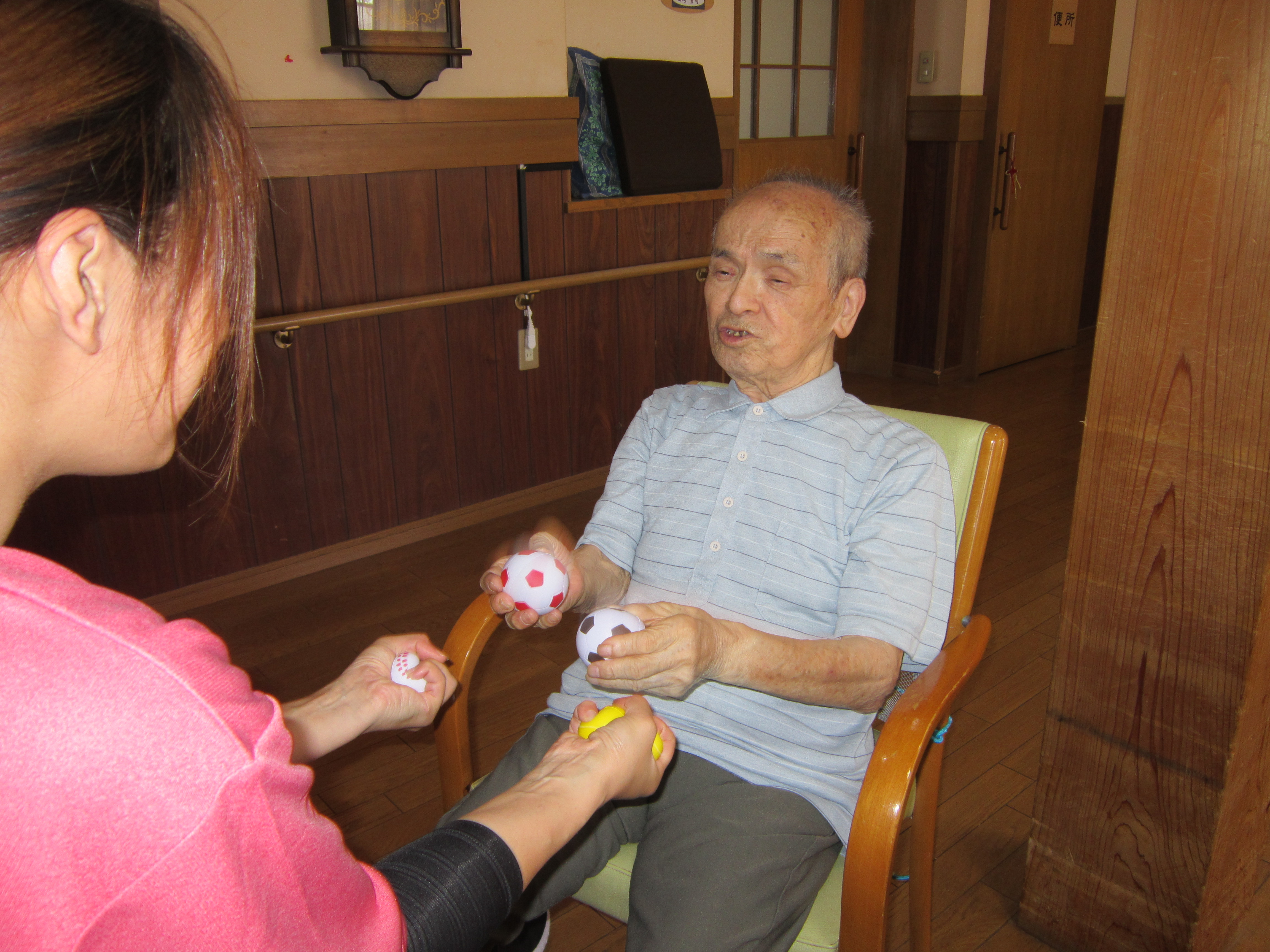 こちらのお父さんはボールを使って手の運動をしています。